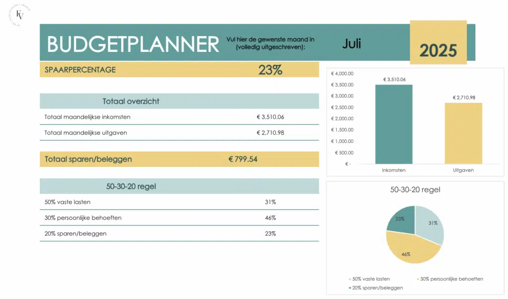 Ik heb gekeken hoe deze regel voor mij heeft uitgepakt in juli 2025. Mijn vaste lasten kwamen uit op 31%. Dit is een stuk lager dan de 50%. Qua persoonlijke behoeften kwam ik een stuk hoger uit dan de voorgaande maanden; 46% van mijn inkomsten gingen naar persoonlijke behoeften. Dit komt vooral door vakantie uitgaven. Tot slot ging 23% naar sparen/beleggen🔥. Meer informatie over de 50-30-20 regel lees je in dit blog artikel: https://opwegnaarfinancielevrijheid.com/50-30-20-regel