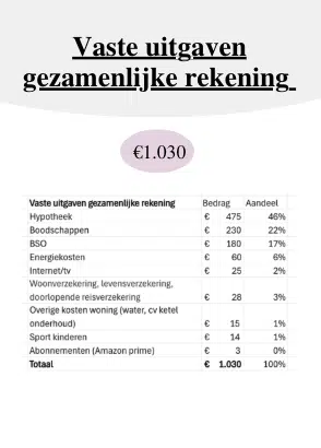In onderstaand overzicht kun je zien wat ik per maand kwijt ben aan onze hypotheek, de boodschappen, 2 middagen BSO per week voor onze kinderen, gas/water/licht etc. Zodra mijn salaris gestort is, wordt er automatisch €1.030 overgeschreven naar onze gezamenlijke rekening om de vaste uitgaven te kunnen betalen.